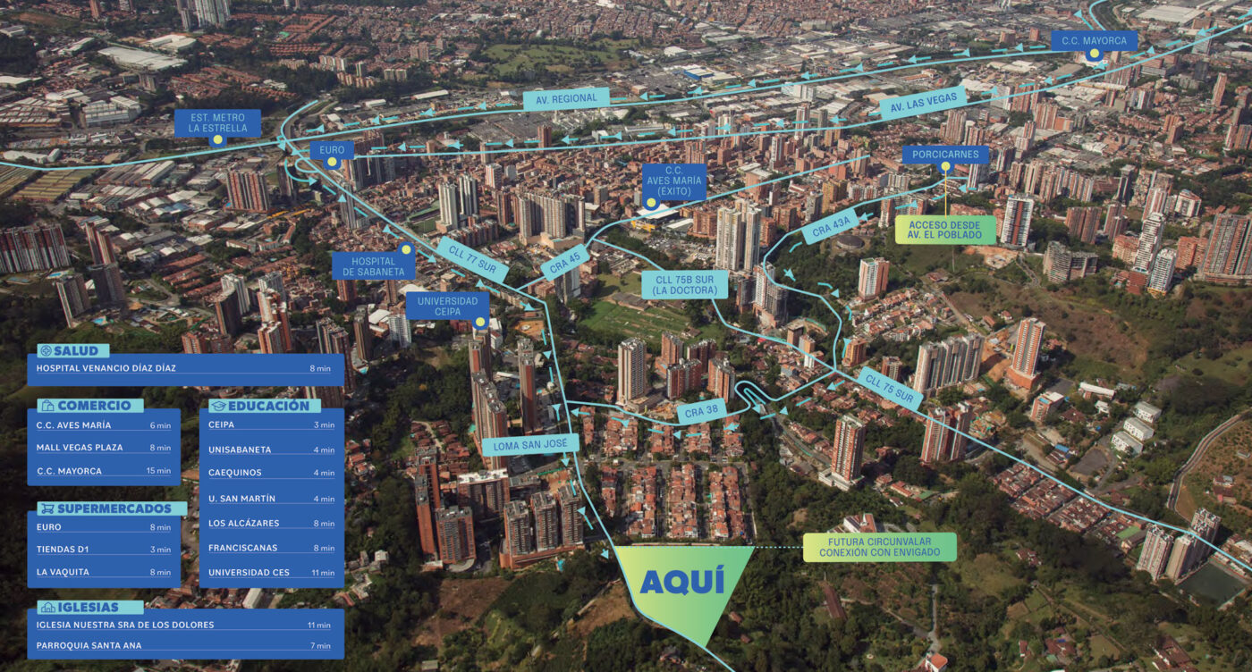 El proyecto Ecoh está ubicado en Sabaneta, sector Loma San José, su excelente ubicación permite acceder fácilmente a supermercados, almacenes de cadena, centros comerciales y de entretenimiento, colegios y hospitales.