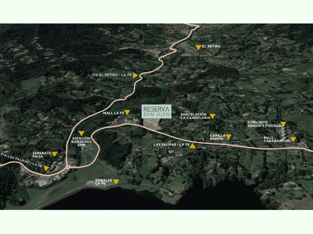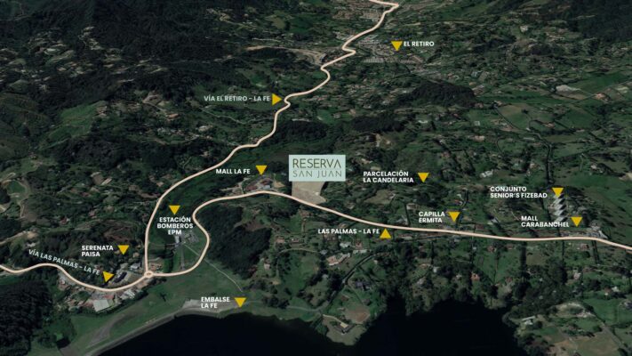 Ubicado en El Retiro, a solo 25 minutos de Medellín, en el sector Mall la Fe. Rodeado de 8.000 m2 de bosque y zonas comunes a la vanguardia como: coworking dotado, simulador de golf, zona húmeda, sala de juegos, jardín infantil y senderos.