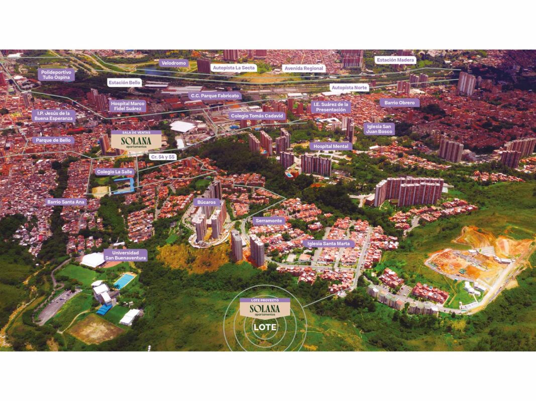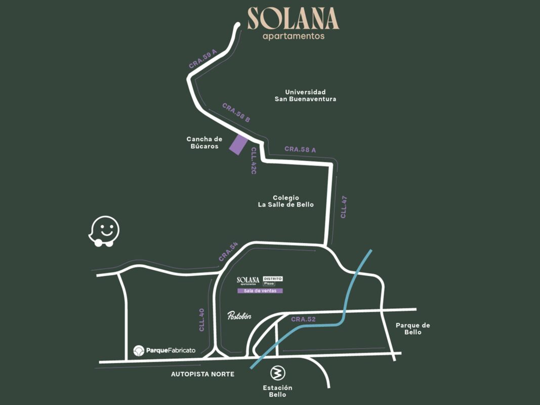 Solana está ubicado en Bello, sector Búcaros – Santa Ana. Su excelente ubicación permite acceder fácilmente a supermercados, almacenes de cadena, centros comerciales y de entretenimiento, colegios y hospitales.